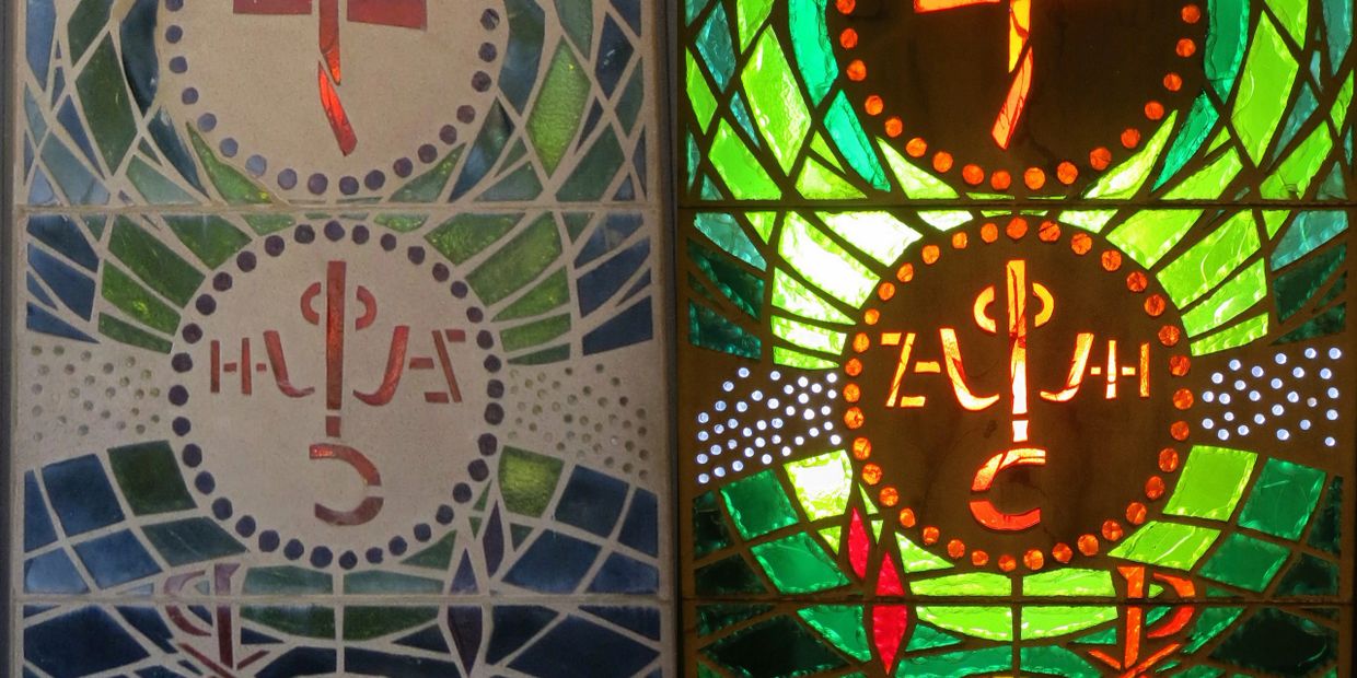 To reflect the desert, the Cathedral's and Chapel's faceted glass is embedded in sandy concrete.